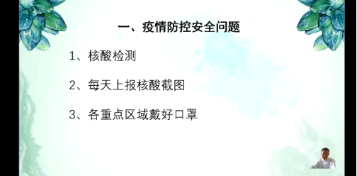为进一步增强学生安全意识,切实把安全教育工作落到实处。按照学院“疫情防控期间校园全封闭管理实施方案”的要求,上周以来各班在辅导员的组织下,召开了线上安全教育主题班会,对学生进行常态化疫情防控教育,包括新冠病毒防护的知识普及,日常生活、学习时的自我防护措施,班会要求学生严格遵守学校疫情防控工作要求,实施身体健康监测制度,出现不适及时上报,按照规范就医,正确引导学生科学防护,按照要求戴口罩、勤洗手,合理进行体育锻炼,健康饮食,正常作息,提高身体素质和免疫力。此外,各位辅导员还强调了人身财产安全、交通安全、消防安全、意识形态安全、防网络信息诈骗等多方面的安全教育工作。