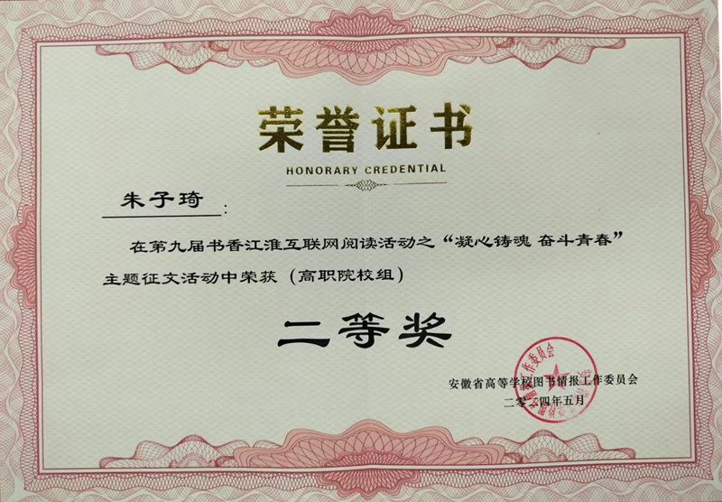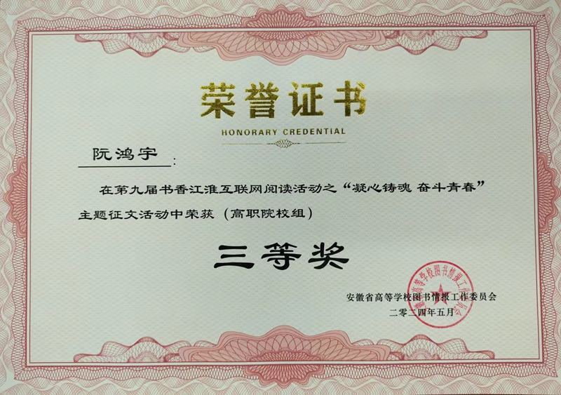 第九届书香江淮“凝心铸魂 奋斗青春”主题征文活动由安徽省高等学校图书情报工作委员会主办,全省各高校图书馆共同参与。经专家评审,共评选出普通高校组一等奖2名,二等奖8名,三等奖20名。高职院校组一等奖2名,二等奖8名,三等奖20名。最佳组织单位8个。