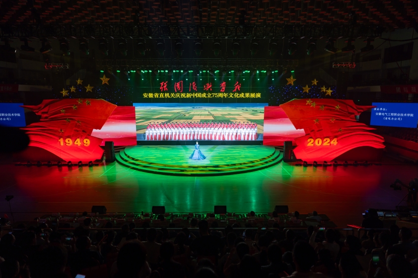 9月29日晚,由安徽省直机关工委主办的“强国复兴有我”省直机关庆祝中华人民共和国成立75周年文化成果展演在安徽省体育馆举行,我院120名学生组成的合唱团应邀参与歌曲《幸福的歌儿传四方》演出,献礼祖国75周岁华诞。