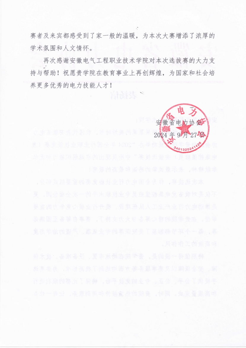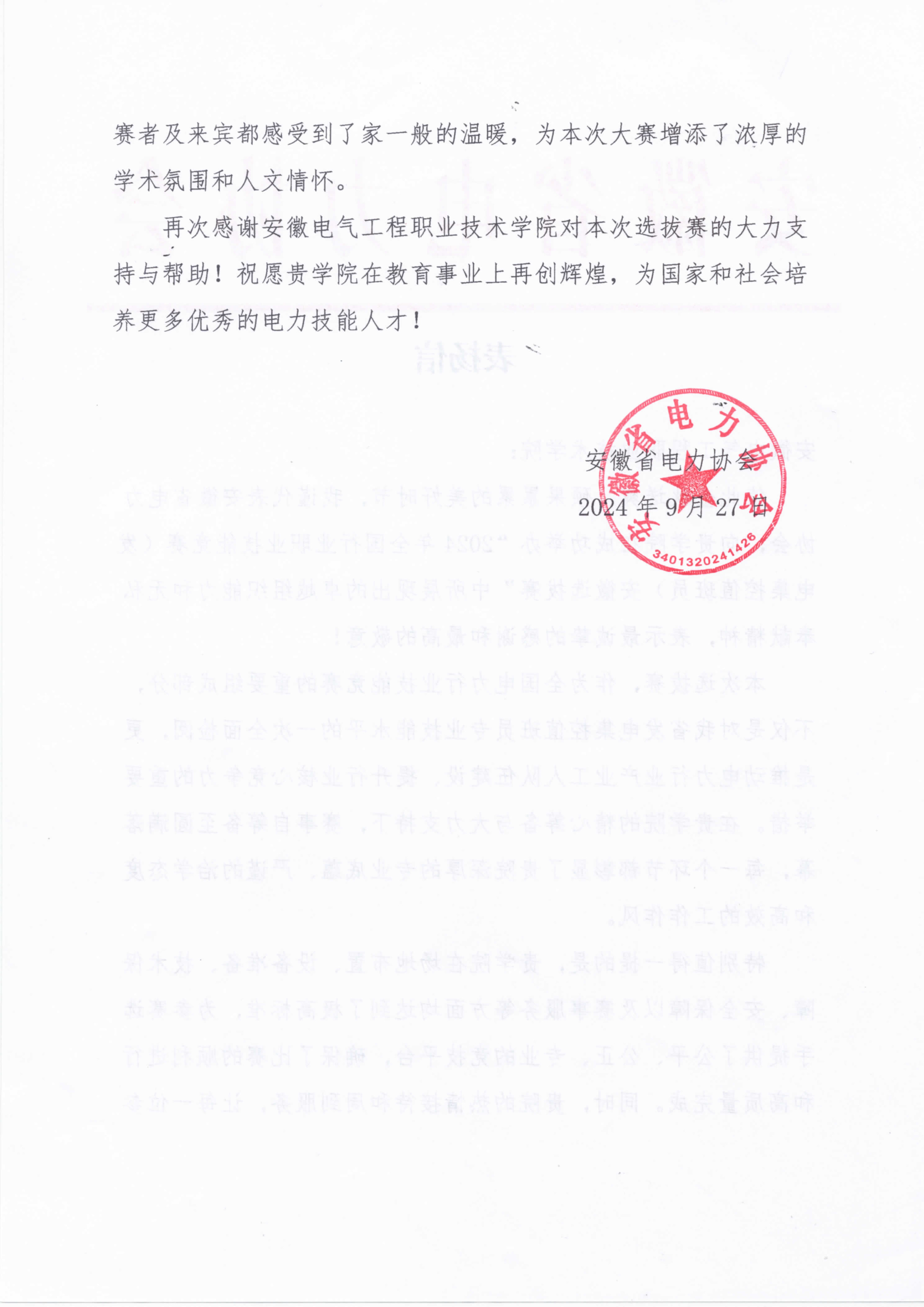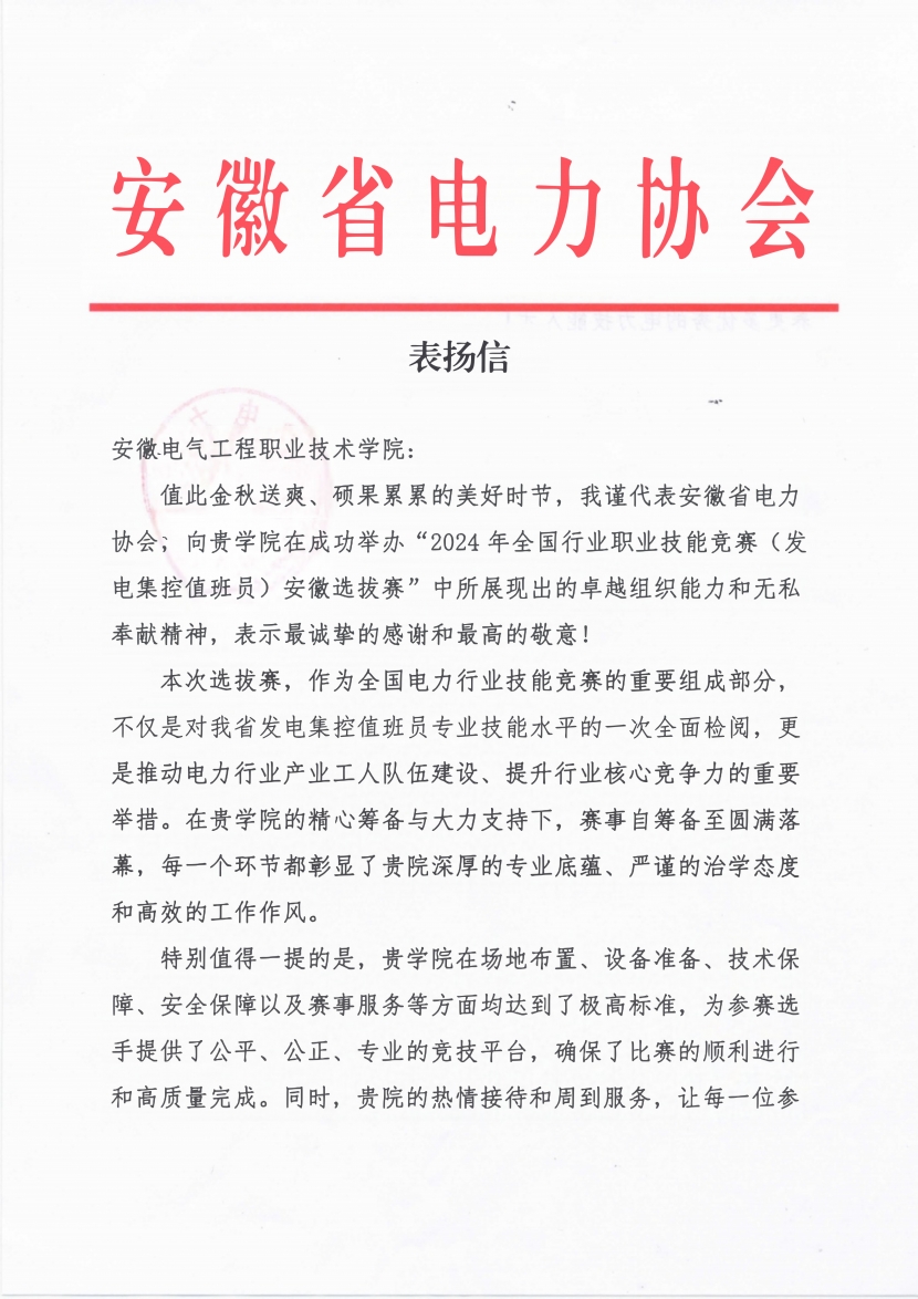 近日,学院收到来自安徽省电力协会的表扬信,信中对学院在全国行业职业技能竞赛(发电集控值班员)安徽选拔赛场地布置、设备准备、技术保障、安全保障以及赛事服务等方面所做出的杰出贡献给予了高度评价与赞扬。