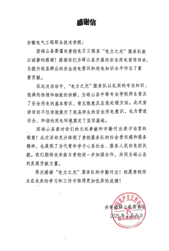 近期电力工程系“电力之光”服务队组织学生党员入党积极分子联合砀山县团委、县教育局等开展用电安全培训进农户、进学校、进社区活动,受到用户的欢迎和有关方面的肯定。现收到砀山县团委感谢信。