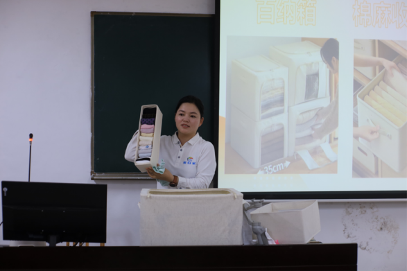 在收纳整理课上,高级收纳师通过讲解与分组实操,带领同学们开启了一场收纳之旅。从家到宿舍,从空间布置到衣物折叠,同学们饶有兴致,积极参与互动实操,课堂氛围热烈。通过此次收纳整理讲座,让学生们学会今后用亲身劳动创造舒适整洁的宿舍环境,养成爱干净整洁的行为习惯,对自身身心健康大有裨益。