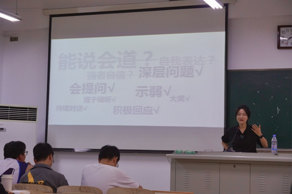 社交沟通课上,吴老师结合自身成长经验,通过生动的案例及互动,分析了如何实现从“社恐”到“社牛”的转变,鼓励同学们掌握社交技巧,勇敢表达,现场不时响起阵阵掌声。