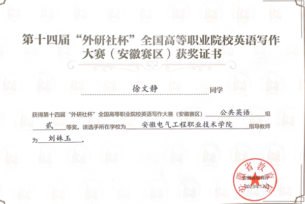 11月4日至5日,由安徽省教育厅主办的2023“外研社杯”全国高职高专院校职场英语挑战赛(安徽赛区)在合肥财经职业学院举行。来自安徽省60余所高职高专院校近200余名选手参赛。经过激烈角逐,学院自动化与信息工程系22级电气自动化技术专业徐文静同学同学获得英语挑战赛写作大赛(公共英语组)二等奖,基础教学部英语教研室刘姝玉老师荣获优秀指导教师。