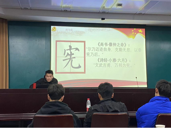 演讲围绕着“弘扬宪法精神· 建设法治中国”主题开展,从“何为宪”、“何为法”、“宪法存在的社会意义”、“宪法的具体内容和历史沿革”等方面进行讲解,层层递进。在讲解过程中,刁鑫才同学图文结合、案例分析,并以提问的方式与同学们互动,让同学们更深入地解什么是宪法,宪法的内容以及宪法对于普通公民的生活具有什么意义等各个方面的知识。此次讲座不仅引导学生更加深入了解宪法、尊崇宪法精神,增强法治观念,更有效地推动了普法工作的深入开展,让同学们主动捍卫宪法,弘扬宪法精神,当好社会主义法治理念的传播者与践行者,营造良好的校园法治环境。