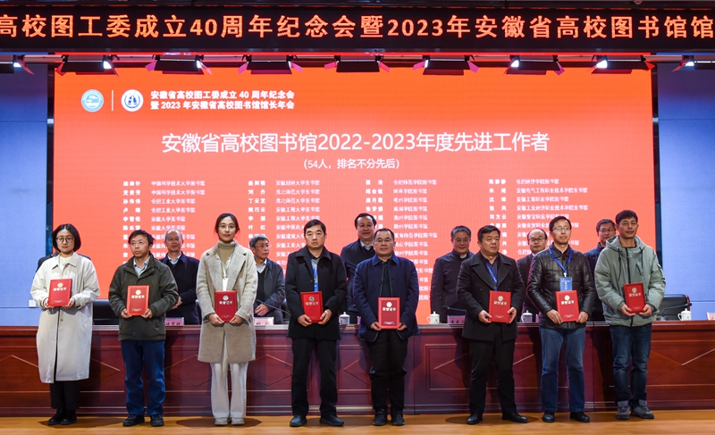 会议表彰了“安徽省高校图书馆事业突出贡献者”“榜样馆长”“榜样馆员”“2022-2023年度先进集体”“优秀馆长”“先进工作者”,为获得荣誉称号的集体和个人颁发奖牌、奖杯和证书。朱靖同志获评2022-2023年度安徽省高校图书馆“先进工作者”荣誉称号,并登台领奖。