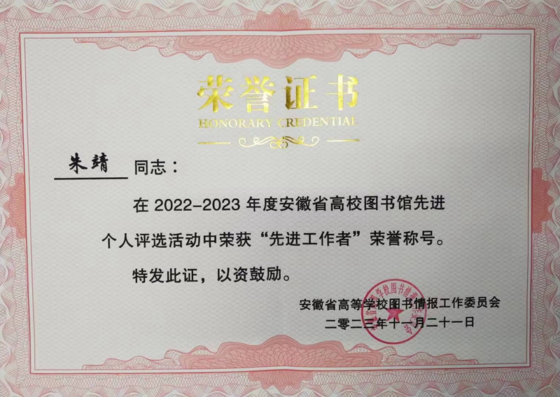 学院图书馆馆员荣获2022-2023年度安徽省高校图书馆先进工作者