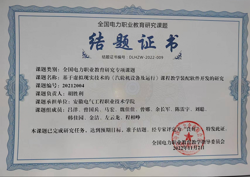 系部围绕年度重点工作任务,积极开展课程思政、示范课教学、教科研等工作,完成全国电力职业教育研究课题“基于虚拟现实技术的《汽轮机设备及运行》课程教学装配软件开发的研究”,以“良好”结题;继续做好“遴选360个国家级教师教学创新团队”2项省教育厅提质培优项目、“发电运行技术特色高水平专业”等12项质量工程项目、教学示范课“双基”项目和“垃圾发电厂渗滤液处理技术研究”等6项科研项目建设工作;2022年系部教师发表教科研论文5篇,其中中文核心期刊论文1篇;软件著作权2项。积极开展校企合作、产教融合工作,完成签订一家实习实训基地协议,与2家发电企业签订“飞灰养护车间废气收集处理的研究与应用”、“高温过热器管排腐蚀机理的研究”等2项横向技术研究科研项目;完成专业社会服务和培训工作。