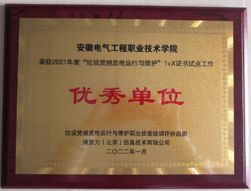 学院作为垃圾焚烧发电运行与维护、发电集控运维两项X证书的安徽省牵头院校,动力系作为证书对接实施部门,系部积极对接证书培训评价组织,及时反馈证书试点中存在的困难及问题,发挥牵头院校协调组织作用,认真做好技能等级培训与考核等工作,在X证书评价组织年度考核中,学院荣获2021年度“垃圾焚烧发电运行与维护”1+X证书试点工作“优秀单位”,系部魏佳佳、刘聪两名教师分别被授予“优秀个人”称号。